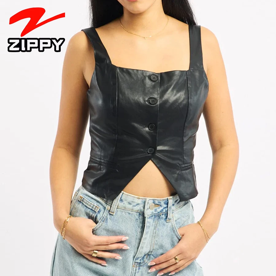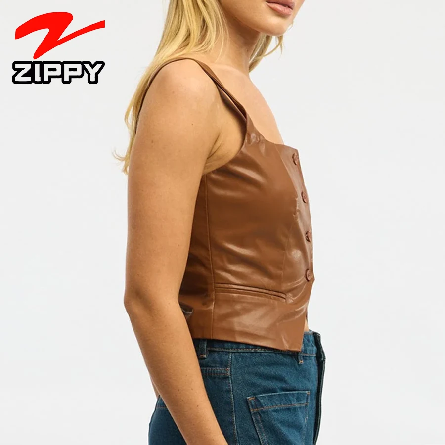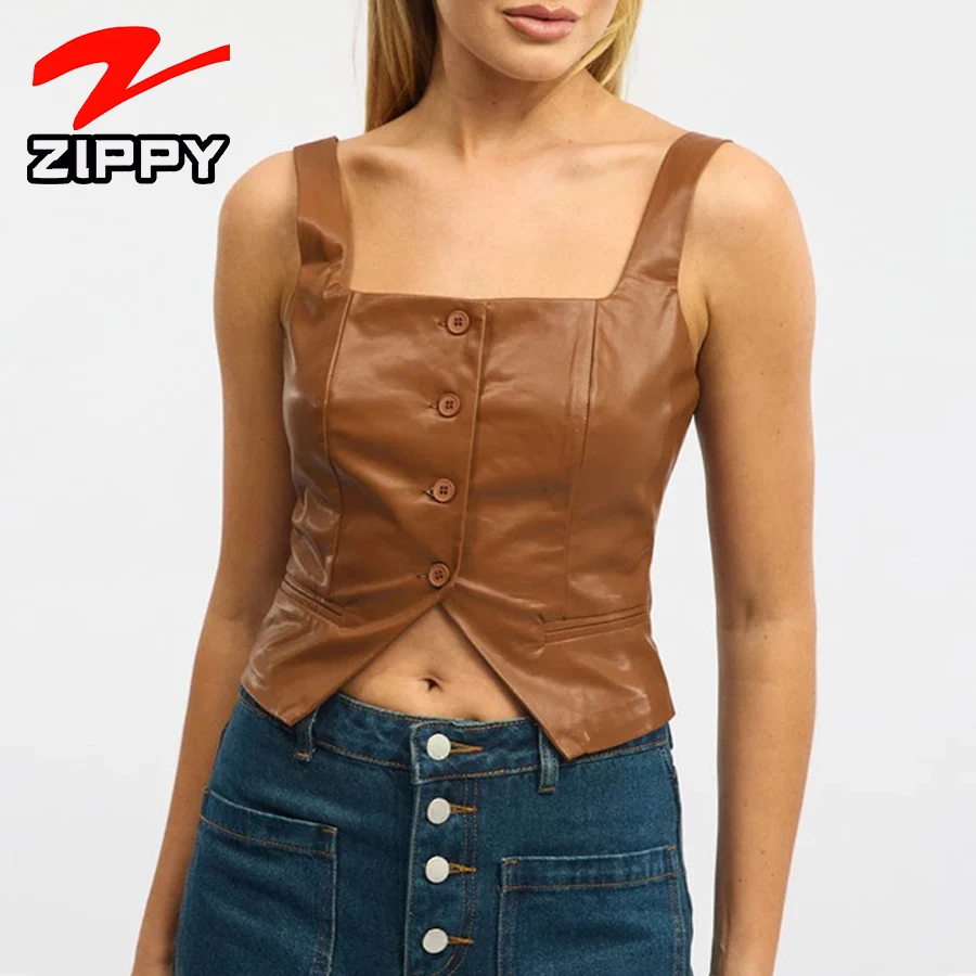 Customization Sexy Elegant Camisole Top Fashionable Simple PU Leather Square-neck Single-button Fitted tank Top